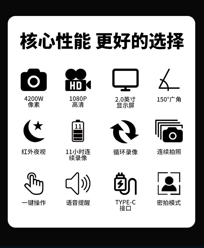• 產(chǎn)品描述:4200萬高清像素 高清紅外夜視 11小時大容量超長續(xù)航 輕巧便攜隨身 一鍵操作 適用于酒店管理 物業(yè)管理 公安執(zhí)法 鐵路巡檢 個人旅游等